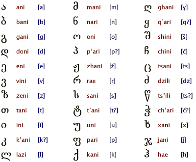 El georgiano es interesante por su doble influencia. Como su lenguaje vecino, el armenio, tiene influencias griegas en el orden de las letras, mientras que la influencia iraní es visible en las formas cursivas de las letras ( especialmente las formas antiguas)  y la abundancia de sibilantes nos recuerdan al Pahlavi una antigua escritura de Irán.