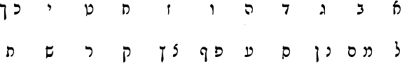 El alfabeto hebreo es un descendiente del alfabeto arameo, el cual a su vez es descendiente del alfabeto fenicio. Como el árabe, el alfabeto hebreo es un abajad es su forma tradicional ( un alfabeto consistente solo de consonantes), se escribe de derecha a izquierda. Tiene 22 letras, 5 de las cuales tiene formas diferentes al final de una palabra (llamadas «sofit»). El hebreo es un alfabeto que carece de letras «mayúsculas», también se le llama al alfabeto debido a las dos primeras letras.