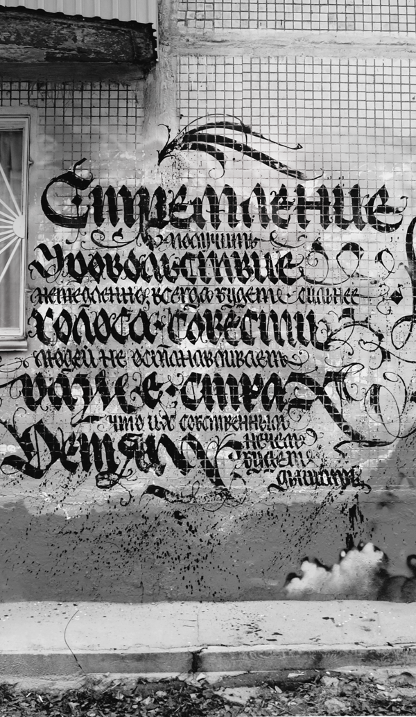 Un artista ruso de Moscú que combina las formas de caligrafía gótica y el trazo de nuevos instrumentos de trazo como latas de spary, plumones gruesos y «colapens» en un interesante arte urbano, además de tener un interesante estilo de letra gótica para el alfabeto cirílico.