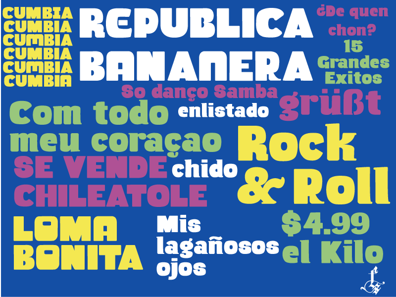 Versión itálica de Musa Paradisica, diseñada a partir de logotipos y rótulos de música tropical y similares, de ahí que sus formas rescaten la alegría y ritmo de este ambiente. Cuenta con alternativas de mayúsculas simples y adornadas desde su menú de Opentype.