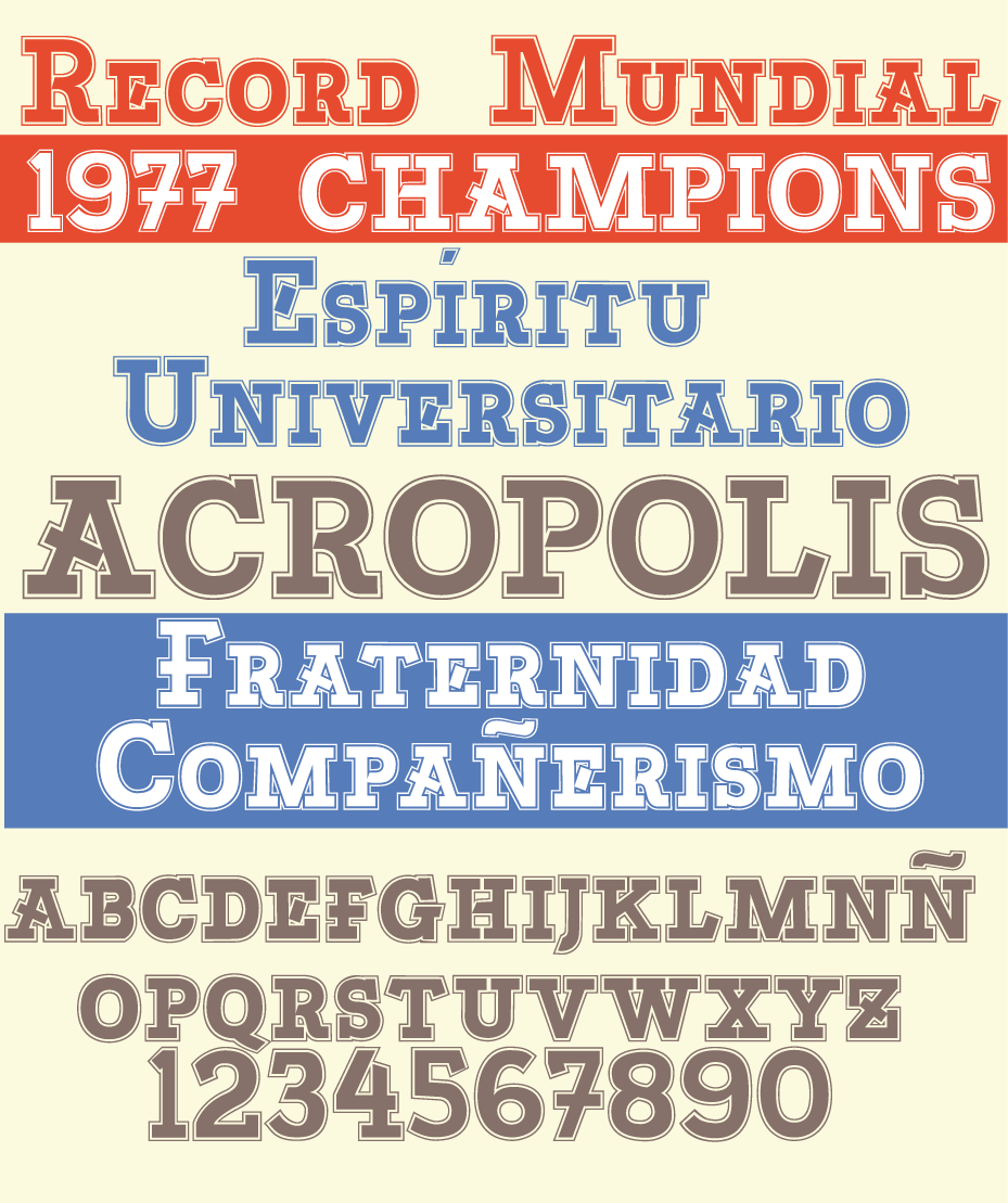 Parte de una familia extensa en la que he estado trabajando, Báscula, esta versión con versalitas y ese outline exterior típico de las letras de universidad americana y de eventos deportivos, tiene los elementos angulosos y llamativos caracteristicos de sus demas hermanas.